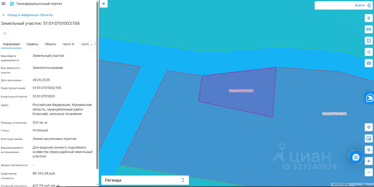 Земельный участок с кадастровым номером 51:01:0701003:156 площадь 202 по адресу Российская Федерация, Мурманская область, муниципальный район Кольский, сельское поселение Тулома