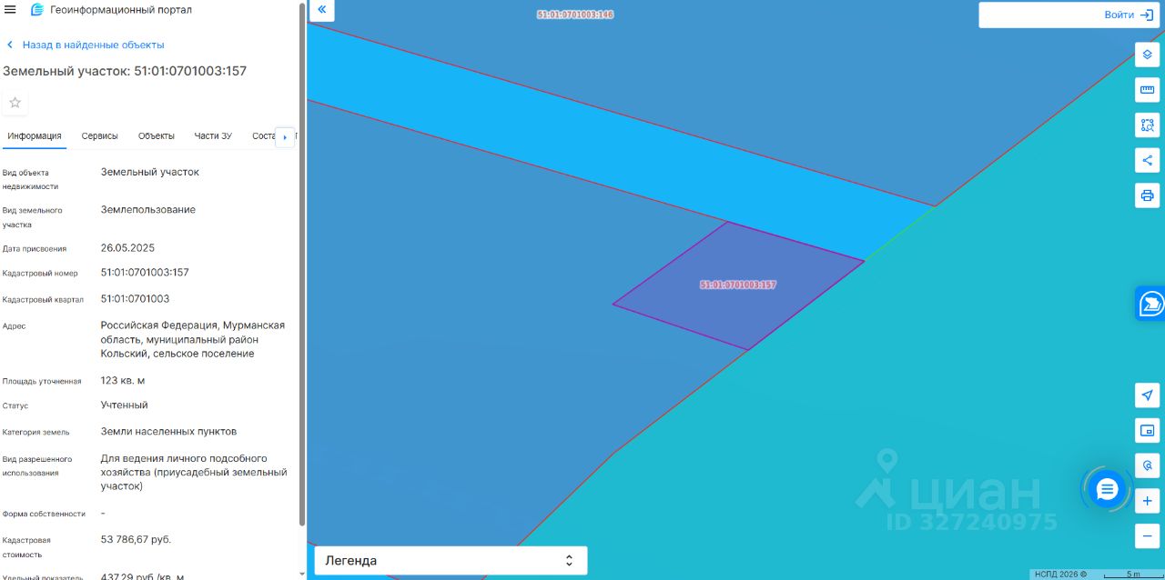 Земельный участок с кадастровым номером 51:01:0701003:157 площадь 123 по адресу Российская Федерация, Мурманская область, муниципальный район Кольский, сельское поселение Тулома