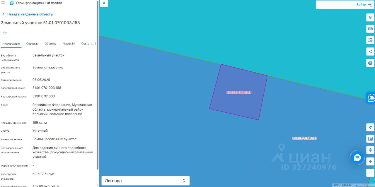 Земельный участок с кадастровым номером 51:01:0701003:158 площадь 159 по адресу Российская Федерация, Мурманская область, муниципальный район Кольский, сельское поселение Тулома