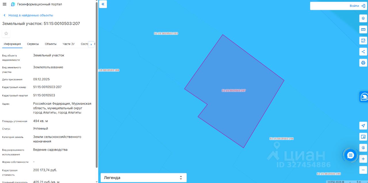 Земельный участок с кадастровым номером 51:15:0010503:207 площадь 494 по адресу Российская Федерация, Мурманская область, муниципальный округ город Апатиты, город Апатиты