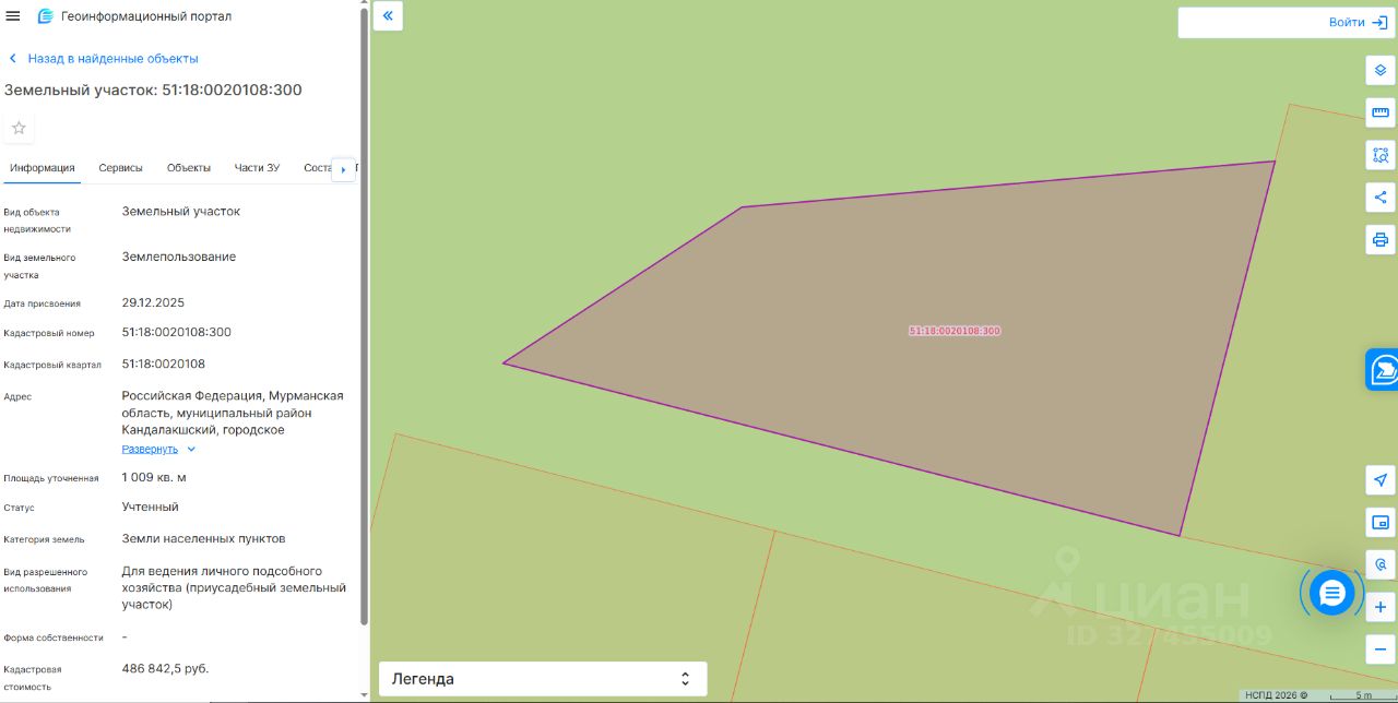 Земельный участок с кадастровым номером 51:18:0020108:300 площадь 1009 по адресу Российская Федерация, Мурманская область, муниципальный район Кандалакшский, городское поселение Кандалакша, город Кандалакша