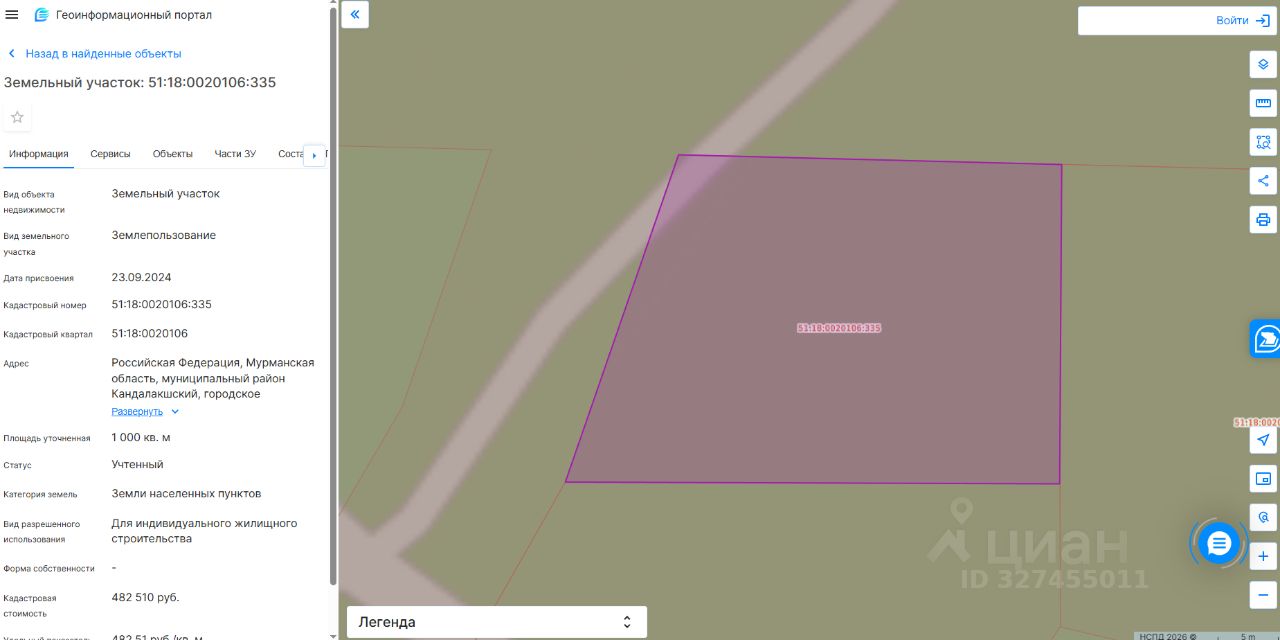 Земельный участок с кадастровым номером 51:18:0020106:335 площадь 1000 по адресу Российская Федерация, Мурманская область, муниципальный район Кандалакшский, городское поселение Кандалакша, город Кандалакша