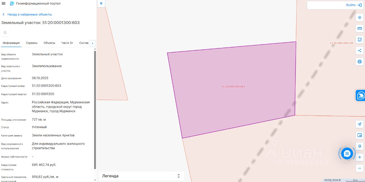 Земельный участок с кадастровым номером 51:20:0001300:603 площадь 727 по адресу Российская Федерация, Мурманская область, городской округ город Мурманск, город Мурманск