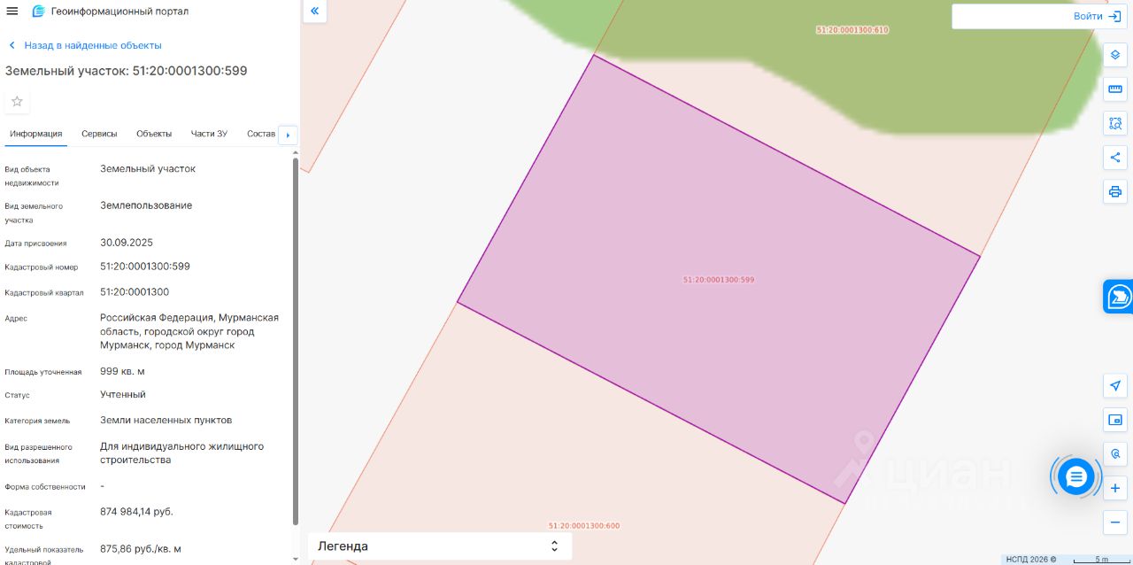 Земельный участок с кадастровым номером 51:20:0001300:599 площадь 999 по адресу Российская Федерация, Мурманская область, городской округ город Мурманск, город Мурманск