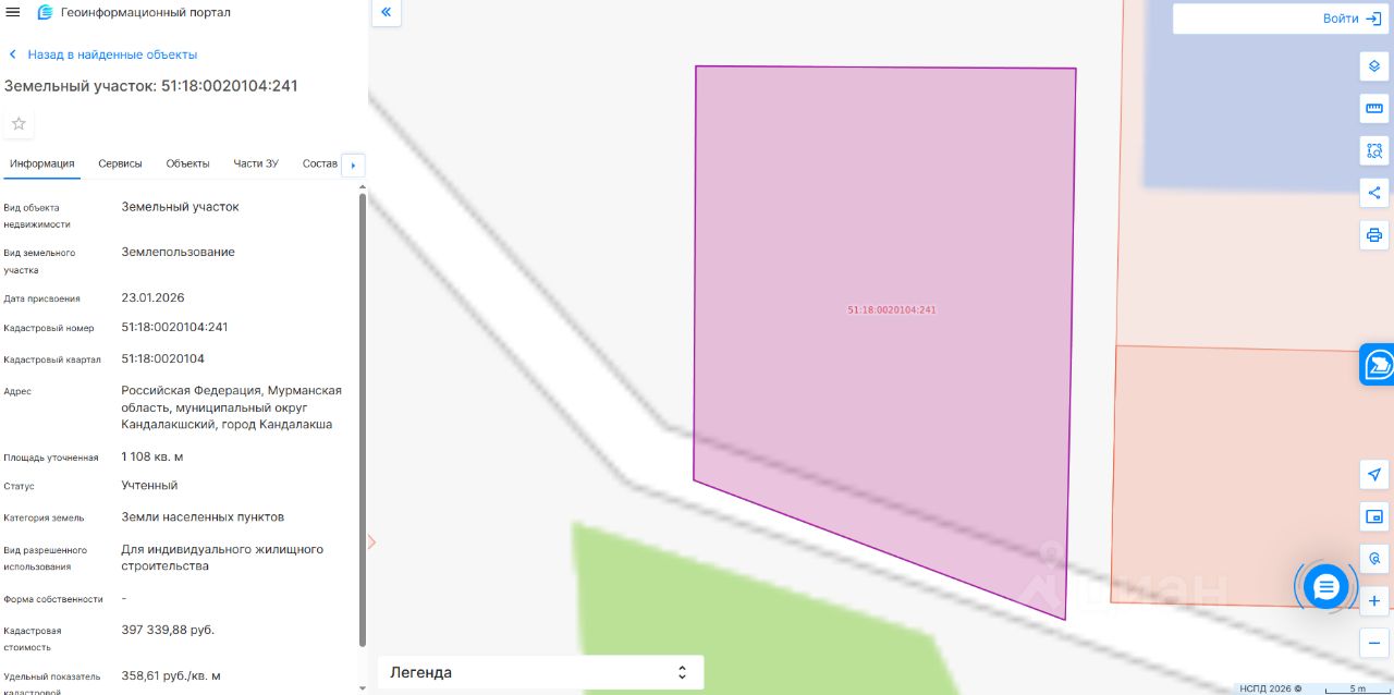 Земельный участок с кадастровым номером 51:18:0020104:241 площадь 1108 по адресу Российская Федерация, Мурманская область, муниципальный округ Кандалакшский, город Кандалакша