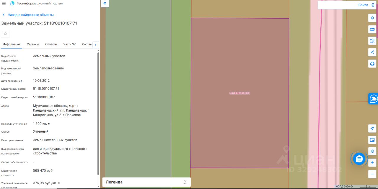 Земельный участок с кадастровым номером 51:18:0010107:71 площадь 1500 по адресу Мурманская область, м.р-н Кандалакшский, г.п. Кандалакша, г Кандалакша, ул 2-я Парковая