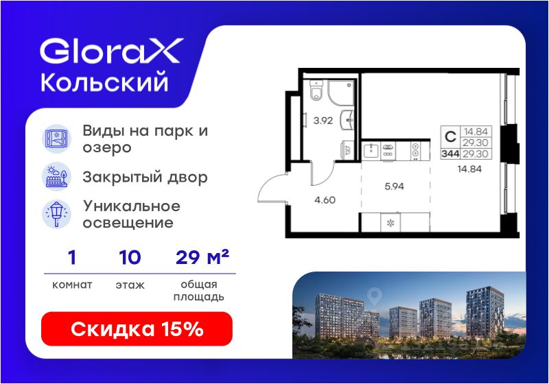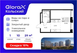 Продается квартира-студия на 10-м этаже в проекте бизнес-класса GloraX Кольский. Общая площадь лота составляет 29,30 кв. м, из которых 14,84 кв. м отведено под жилую и 5,94 кв. м под кухонную зону. Номер квартиры - 344.
