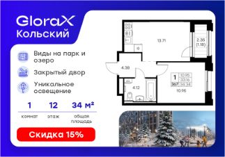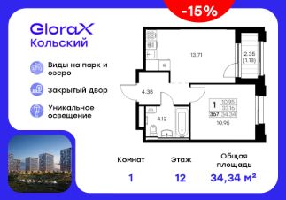 Продается 1-комн. квартира на 12-м этаже в проекте бизнес-класса GloraX Кольский. Общая площадь лота составляет 34,34 кв. м, из которых 10,95 кв. м отведено под жилую и 13,71 кв. м под кухонную зону. Номер квартиры - 367.