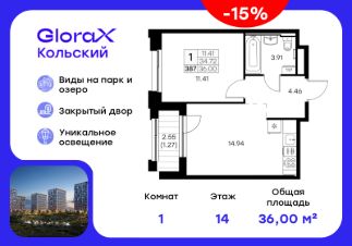 Продается 1-комн. квартира на 14-м этаже в проекте бизнес-класса GloraX Кольский. Общая площадь лота составляет 36,00 кв. м, из которых 11,41 кв. м отведено под жилую и 14,94 кв. м под кухонную зону. Номер квартиры - 387.
