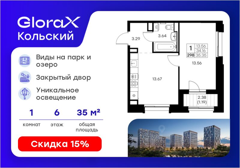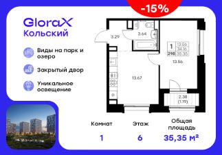 Продается 1-комн. квартира на 6-м этаже в проекте бизнес-класса GloraX Кольский. Общая площадь лота составляет 35,35 кв. м, из которых 13,56 кв. м отведено под жилую и 13,67 кв. м под кухонную зону. Номер квартиры - 298.