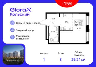 Продается квартира-студия на 8-м этаже в проекте бизнес-класса GloraX Кольский. Общая площадь лота составляет 29,24 кв. м, из которых 14,83 кв. м отведено под жилую и 5,96 кв. м под кухонную зону. Номер квартиры - 321.