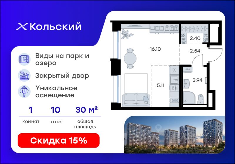 Продается квартира-студия на 10-м этаже в проекте комфорт-класса Кольский. Общая площадь лота составляет 30,09 кв. м, из которых 16,10 кв. м отведено под жилую и 5,11 кв. м под кухонную зону. Номер квартиры - 110.