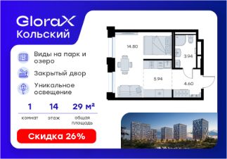 Продается квартира-студия на 14-м этаже в проекте бизнес-класса GloraX Кольский. Общая площадь лота составляет 29,28 кв. м, из которых 14,80 кв. м отведено под жилую и 5,94 кв. м под кухонную зону. Номер квартиры - 163.