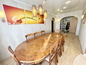 * Квартира состоит из блока 2-х квартир, в которой сделана планировка: кухня-столовая, отдельная гостиная, 3 отдельные комнаты, 1 санузел, 2 большие лоджии застекленные и утепленные (на одной лоджии оборудован рабочий кабинет),1 балкон, просторный коридор.