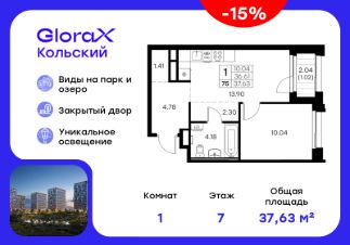 Продается 1-комн. квартира на 7-м этаже в проекте бизнес-класса GloraX Кольский. Общая площадь лота составляет 37,63 кв. м, из которых 10,04 кв. м отведено под жилую и 13,90 кв. м под кухонную зону. Номер квартиры - 75.