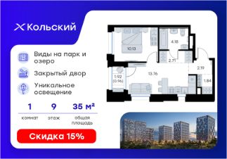 Продается 1-комн. квартира на 9-м этаже в проекте комфорт-класса Кольский. Общая площадь лота составляет 35,77 кв. м, из которых 10,13 кв. м отведено под жилую и 13,76 кв. м под кухонную зону. Номер квартиры - 94.