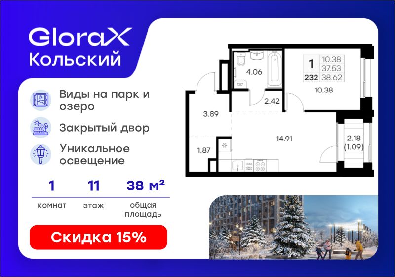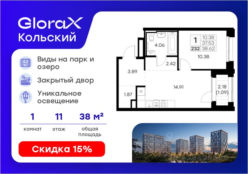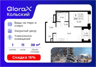 Продается 1-комн. квартира на 11-м этаже в проекте бизнес-класса GloraX Кольский. Общая площадь лота составляет 38,62 кв. м, из которых 10,38 кв. м отведено под жилую и 14,91 кв. м под кухонную зону. Номер квартиры - 232.