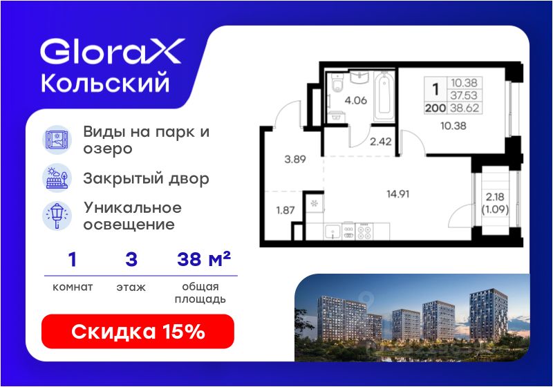 Продается 1-комн. квартира на 3-м этаже в проекте бизнес-класса GloraX Кольский. Общая площадь лота составляет 38,62 кв. м, из которых 10,38 кв. м отведено под жилую и 14,91 кв. м под кухонную зону. Номер квартиры - 200.