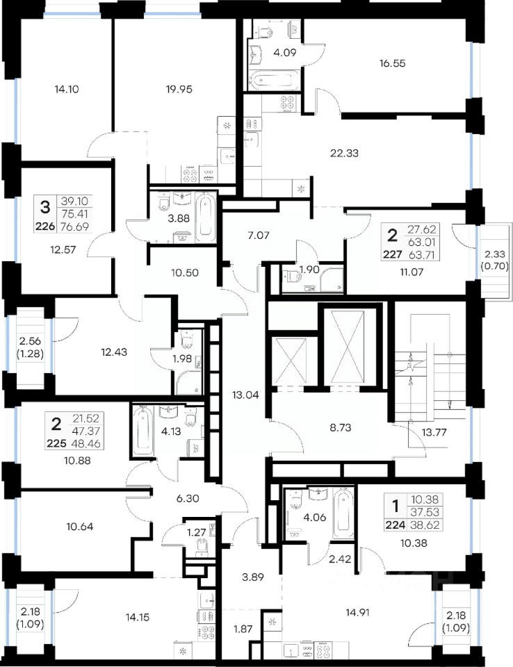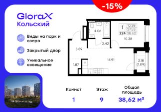 Продается 1-комн. квартира на 9-м этаже в проекте бизнес-класса GloraX Кольский. Общая площадь лота составляет 38,62 кв. м, из которых 10,38 кв. м отведено под жилую и 14,91 кв. м под кухонную зону. Номер квартиры - 224.