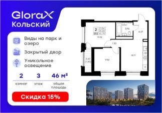 Продается 2-комн. квартира на 3-м этаже в проекте бизнес-класса GloraX Кольский. Общая площадь лота составляет 46,78 кв. м, из которых 21,84 кв. м отведено под жилую и 14,11 кв. м под кухонную зону. Номер квартиры - 252.