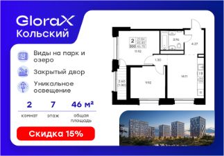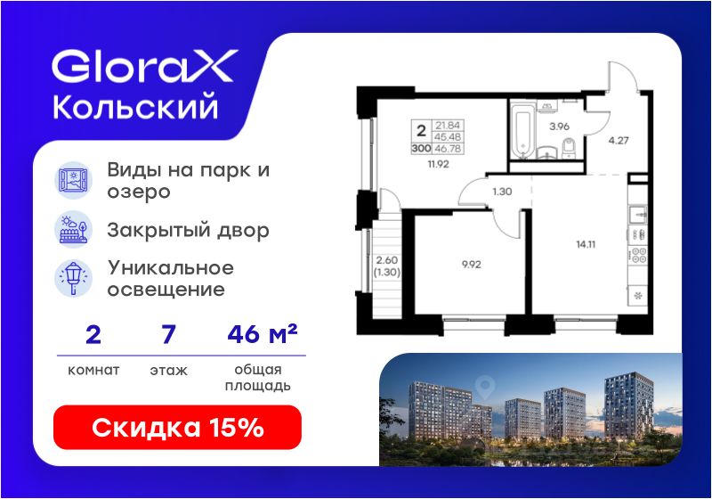 Продается 2-комн. квартира на 7-м этаже в проекте бизнес-класса GloraX Кольский. Общая площадь лота составляет 46,78 кв. м, из которых 21,84 кв. м отведено под жилую и 14,11 кв. м под кухонную зону. Номер квартиры - 300.