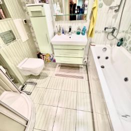 Совмещенный большой санузел с компактной джакузи и душевой кабиной.