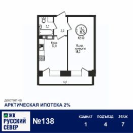 Площадь общая: 42.5м²