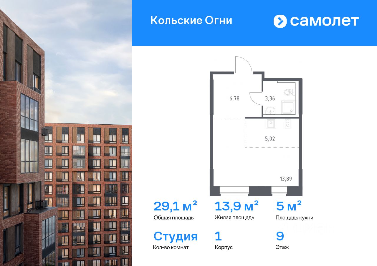 Строим кварталы для жизни с заботой о будущем. Предлагается квартира студия комфорт-класса 29,05 кв.м в корпусе 1 на 9 этаже, в ЖК "Кольские Огни"