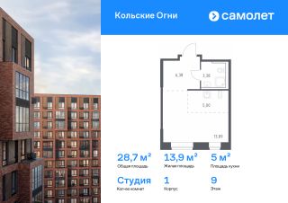 Строим кварталы для жизни с заботой о будущем. Предлагается квартира студия комфорт-класса 28,65 кв.м в корпусе 1 на 9 этаже, в ЖК "Кольские Огни"