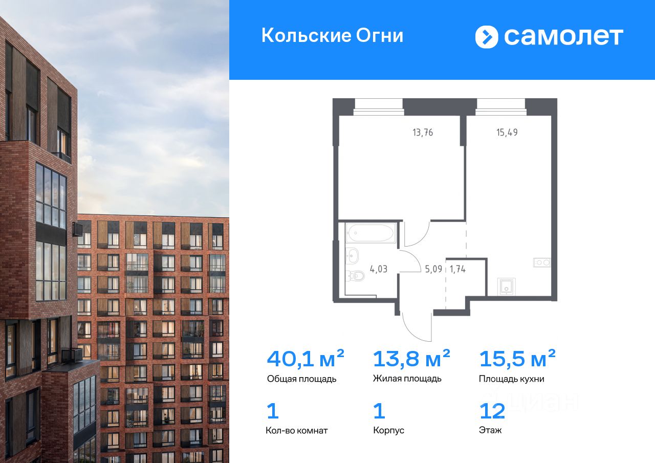 Строим кварталы для жизни с заботой о будущем. Предлагается 1-комнатная квартира комфорт-класса 40,11 кв.м в корпусе 1 на 12 этаже, в ЖК "Кольские Огни"