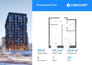 Строим кварталы для жизни с заботой о будущем. Предлагается 1-комнатная квартира комфорт-класса 35,99 кв.м в корпусе 1 на 13 этаже, в ЖК "Кольские Огни"