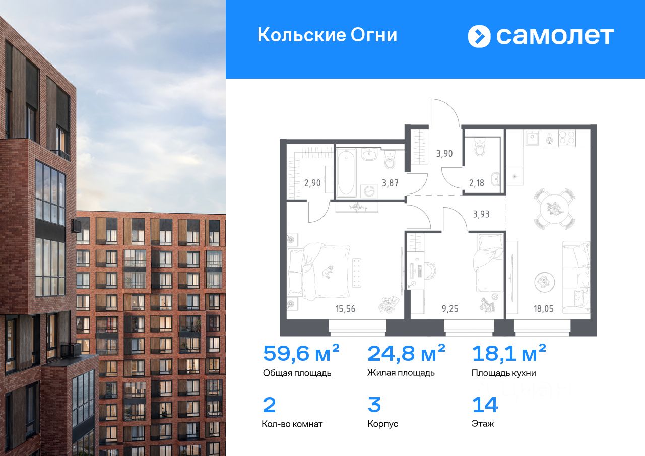 Строим кварталы для жизни с заботой о будущем. Предлагается 2-комнатная квартира комфорт-класса 59,64 кв.м в корпусе 3 на 14 этаже, в ЖК "Кольские Огни"