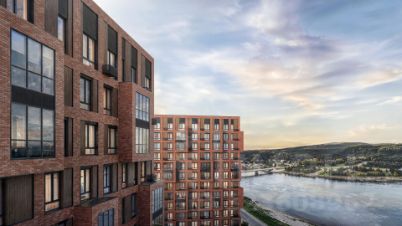 Корпуса высотой 912 этажей и 1417-этажные башни украшают деревянные панели. На входе в подъезды не будет ступеней и высоких порогов. После прогулки велосипеды и коляски можно оставить в местах хранения.