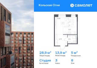 Строим кварталы для жизни с заботой о будущем. Предлагается квартира студия комфорт-класса 28,85 кв.м в корпусе 3 на 8 этаже, в ЖК "Кольские Огни"