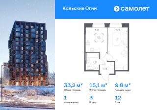 Строим кварталы для жизни с заботой о будущем. Предлагается 1-комнатная квартира комфорт-класса 33,23 кв.м в корпусе 3 на 12 этаже, в ЖК "Кольские Огни"