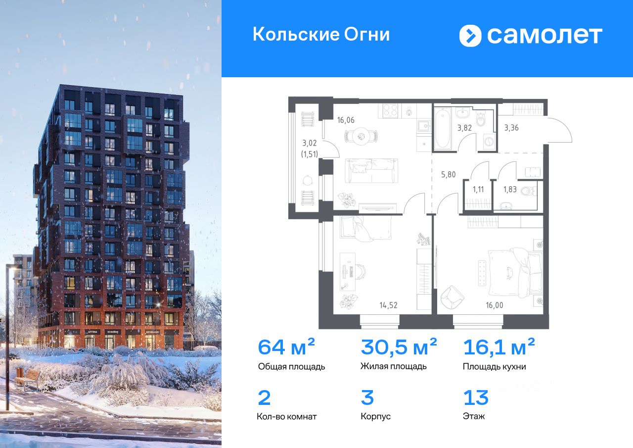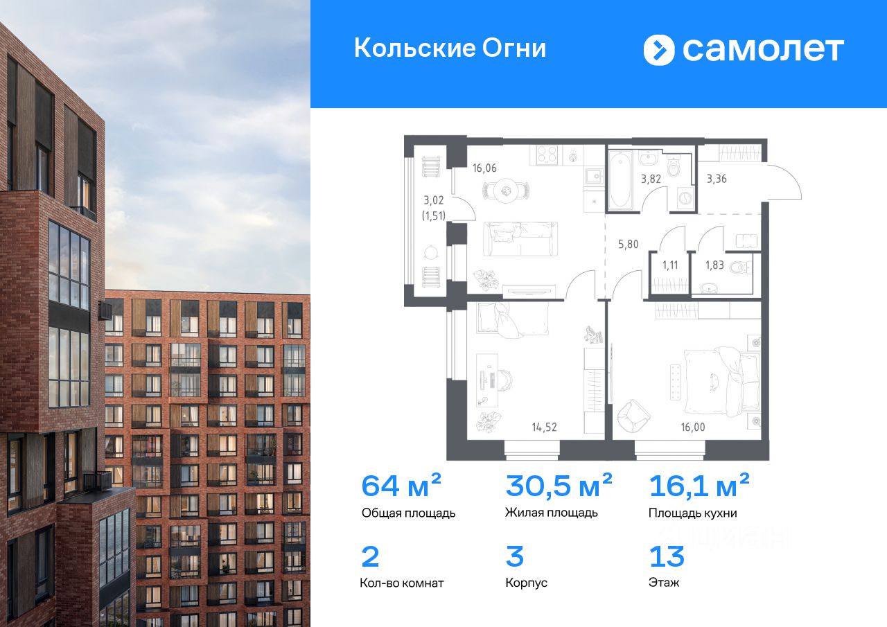 Строим кварталы для жизни с заботой о будущем. Предлагается 2-комнатная квартира комфорт-класса 64,01 кв.м в корпусе 3 на 13 этаже, в ЖК "Кольские Огни"