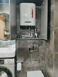 * с/у совмещённый, выложен плиткой керамогранит, подвесной унитаз с инсталляцией, ванна с гидромассажем, водонагреватель;