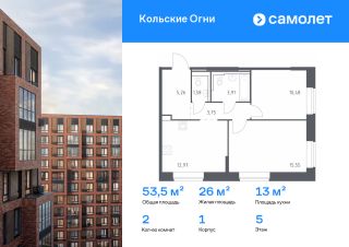 Строим кварталы для жизни с заботой о будущем. Предлагается 2-комнатная квартира комфорт-класса 53,5 кв.м в корпусе 1 на 5 этаже, в ЖК "Кольские Огни"