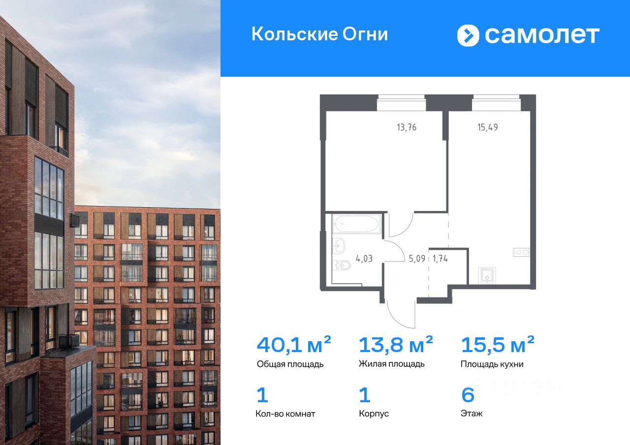 Строим кварталы для жизни с заботой о будущем. Предлагается 1-комнатная квартира комфорт-класса 40,11 кв.м в корпусе 1 на 6 этаже, в ЖК "Кольские Огни"