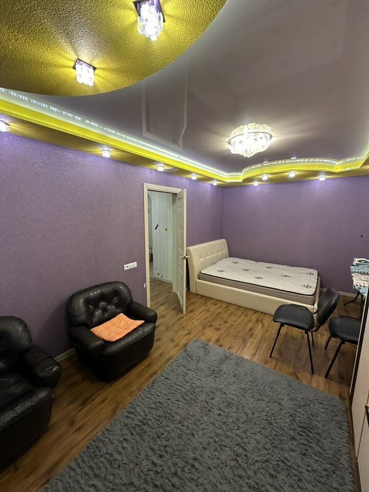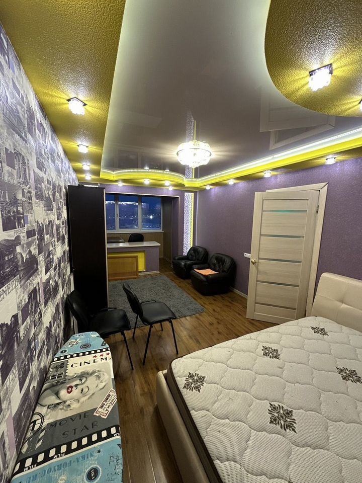 Потолки двухуровневые + натяжной, люстры, доп лампы по всей комнате и светодиодные Ленты. Очень светлая квартира если все включить.