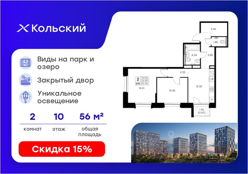 Продается 2-комн. квартира на 10-м этаже в проекте комфорт-класса Кольский. Общая площадь лота составляет 56,46 кв. м, из которых 24,96 кв. м отведено под жилую и 12,32 кв. м под кухонную зону. Номер квартиры - 676.