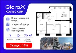 Продается 3-комн. квартира на 10-м этаже в проекте бизнес-класса GloraX Кольский. Общая площадь лота составляет 70,76 кв. м, из которых 35,94 кв. м отведено под жилую и 16,47 кв. м под кухонную зону. Номер квартиры - 684.