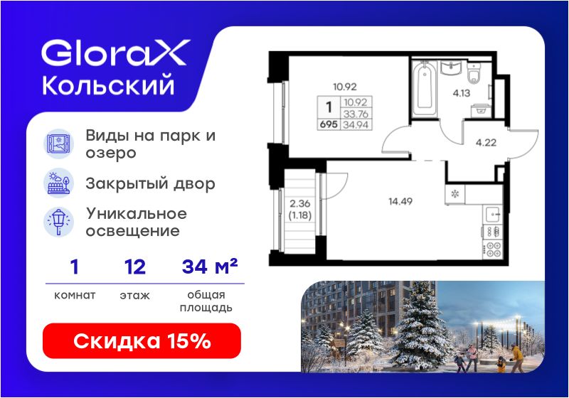 Продается 1-комн. квартира на 12-м этаже в проекте бизнес-класса GloraX Кольский. Общая площадь лота составляет 34,94 кв. м, из которых 10,92 кв. м отведено под жилую и 14,49 кв. м под кухонную зону. Номер квартиры - 695.
