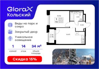 Продается 1-комн. квартира на 14-м этаже в проекте бизнес-класса GloraX Кольский. Общая площадь лота составляет 34,94 кв. м, из которых 10,92 кв. м отведено под жилую и 14,49 кв. м под кухонную зону. Номер квартиры - 713.