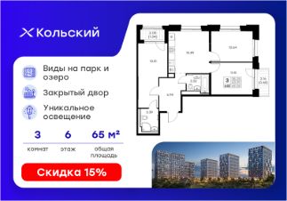 Продается 3-комн. квартира на 6-м этаже в проекте комфорт-класса Кольский. Общая площадь лота составляет 65,08 кв. м, из которых 35,25 кв. м отведено под жилую и 14,49 кв. м под кухонную зону. Номер квартиры - 645.