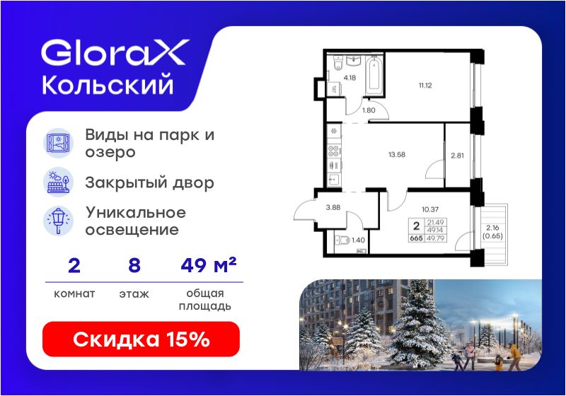 Продается 2-комн. квартира на 8-м этаже в проекте бизнес-класса GloraX Кольский. Общая площадь лота составляет 49,79 кв. м, из которых 21,49 кв. м отведено под жилую и 13,58 кв. м под кухонную зону. Номер квартиры - 665.