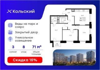 Продается 3-комн. квартира на 8-м этаже в проекте бизнес-класса GloraX Кольский. Общая площадь лота составляет 71,55 кв. м, из которых 39,28 кв. м отведено под жилую и 16,47 кв. м под кухонную зону. Номер квартиры - 666.