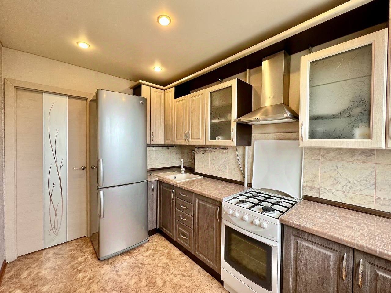 На кухне установлен гарнитур, газовая плита, вытяжка и холодильник — всё остаётся новым владельцам.