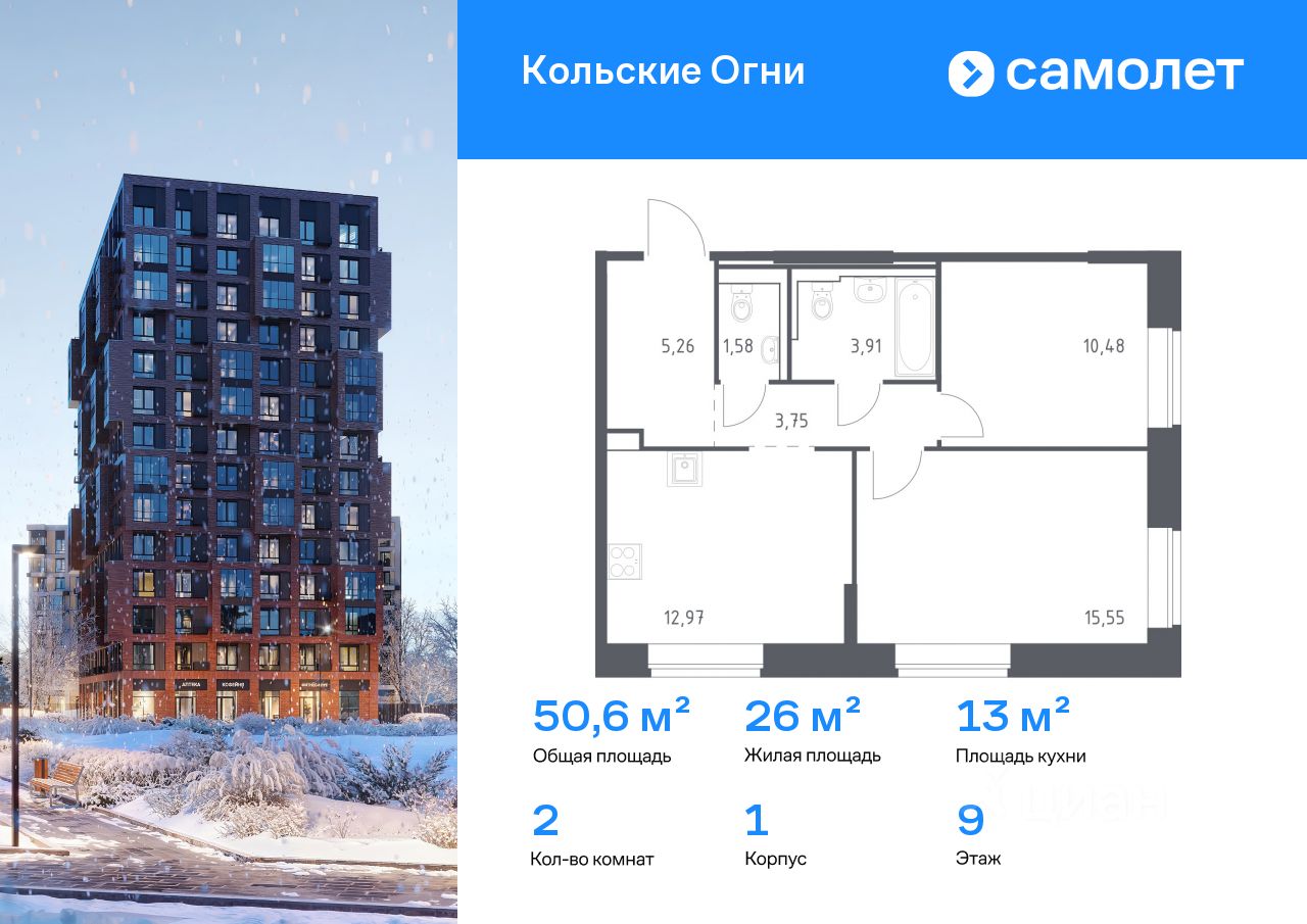 Строим кварталы для жизни с заботой о будущем. Предлагается 2-комнатная квартира комфорт-класса 50,61 кв.м в корпусе 1 на 9 этаже, в ЖК "Кольские Огни"
