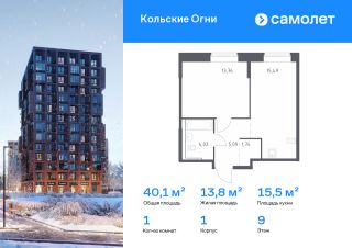 Строим кварталы для жизни с заботой о будущем. Предлагается 1-комнатная квартира комфорт-класса 40,11 кв.м в корпусе 1 на 9 этаже, в ЖК "Кольские Огни"